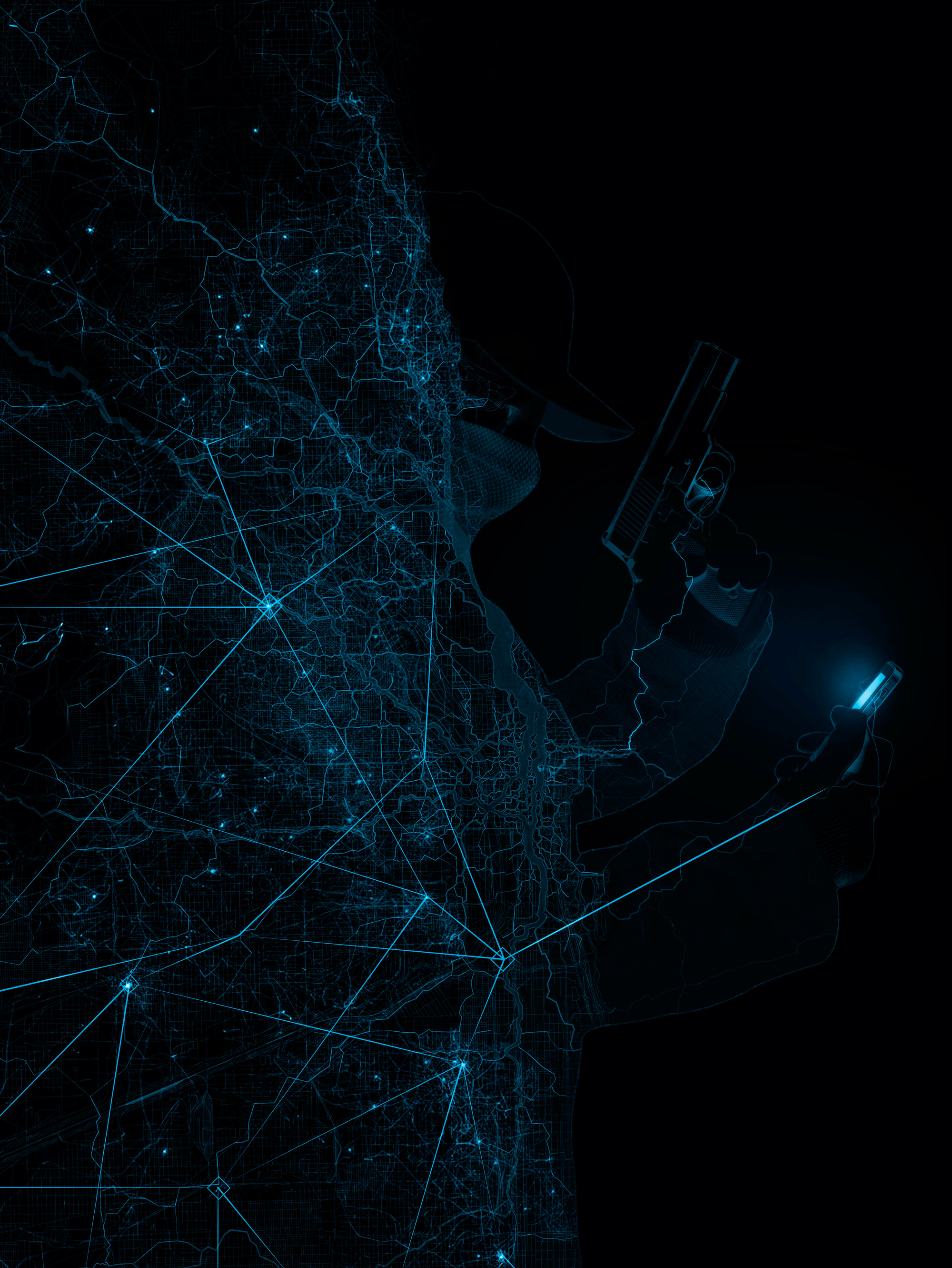 “This cover perfectly captures the spirit and tone of Watch_Dogs. I wanted to highlight the duality of adrenaline and action. The adrenaline is represented well by the organic nature of the blue veins and the grip of the gun slowly becoming the drawn map of Chicago. This contrasted well against the rational and cold side of Watch_Dogs, so the hacking is composed by graphical lines spreading out of Aiden’s smartphone against a backdrop of Aiden’s profile.”